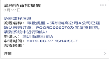 啟用采購(gòu)協(xié)同管理的供應(yīng)商通過微信接收到同步的采購(gòu)訂單信息后,對(duì)所屬的采購(gòu)訂單確認(rèn)后進(jìn)行發(fā)貨。全程高效協(xié)同,實(shí)現(xiàn)有計(jì)劃的集中采購(gòu)(微信端接收信息與處理)。