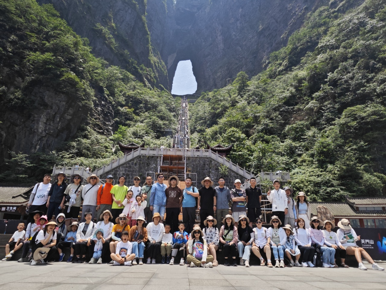 現(xiàn)代技術(shù)與自然風(fēng)光完美的融合,造就了天門山獨(dú)一無二的神話。最后大家在天門洞下留下了珍貴的集體合影。